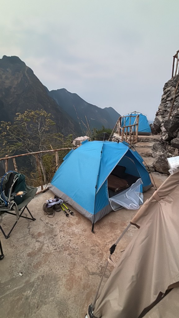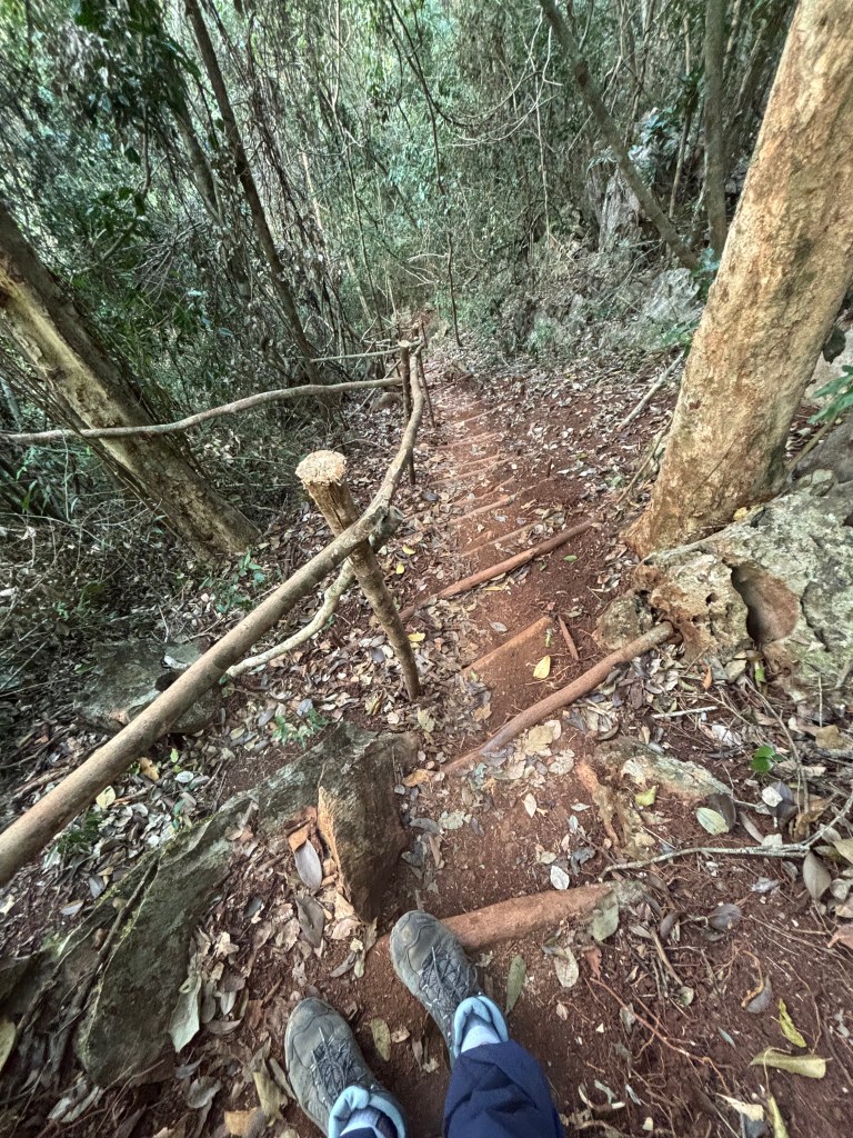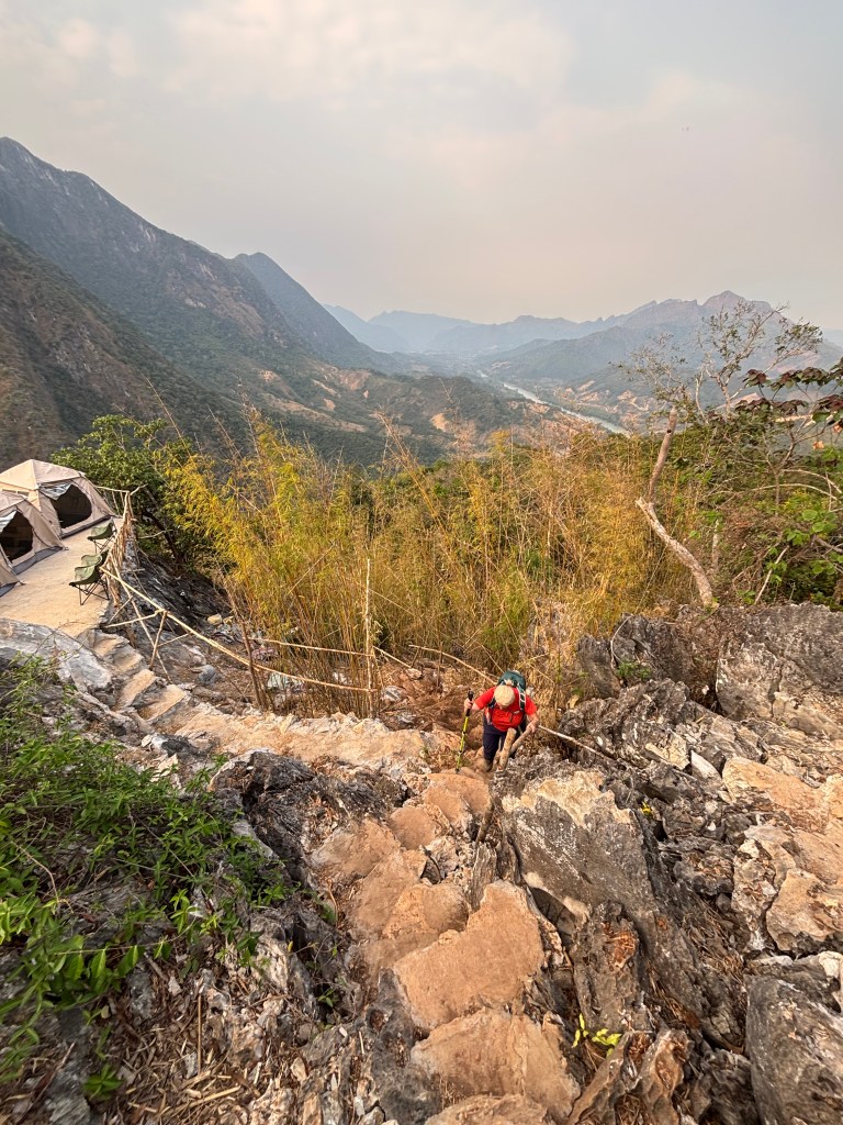 The climb to the top was, for me, really hard. The path is steep, with steps cut into the soil (and worn thin and smooth – hate to think what it i like in the rainy season ) or ladder-like steps made with local wood with knobby handrails. The group made it in 2 hours (the guide wore flip flops…); I took a bit longer and found the heat hard too. Having two walking poles was a hindrance, but one helped. (A group of four young men from South London stuck by me so I wouldn’t walk alone, and they carried the other pole.) But the views were gorgeous and a beer (one could not begrudge paying double the normal price – someone had to carry the stuff up!) delicious. Sleeping in a tent was ok, despite the air mattress being less than fully inflated. I dreaded the thought of having to go to the loo in the night – the volcanic rock path was vicious and jagged.