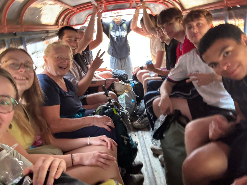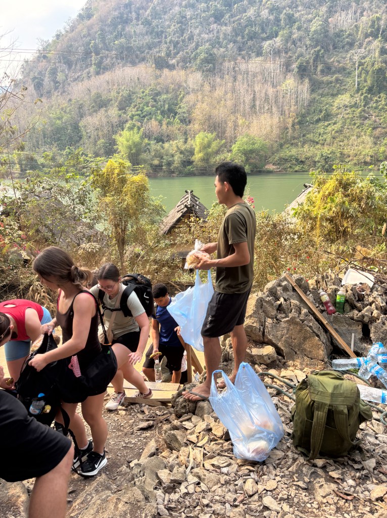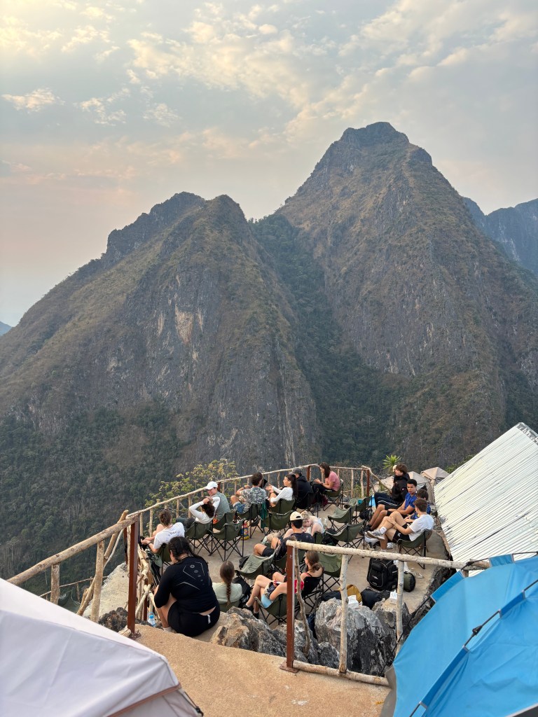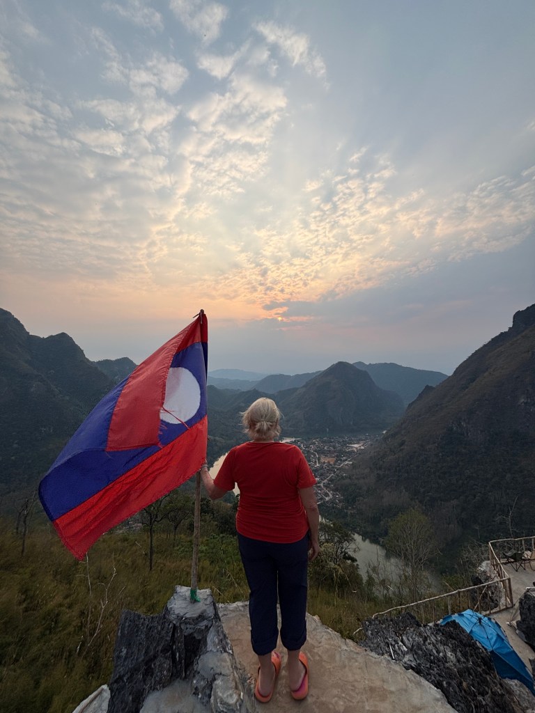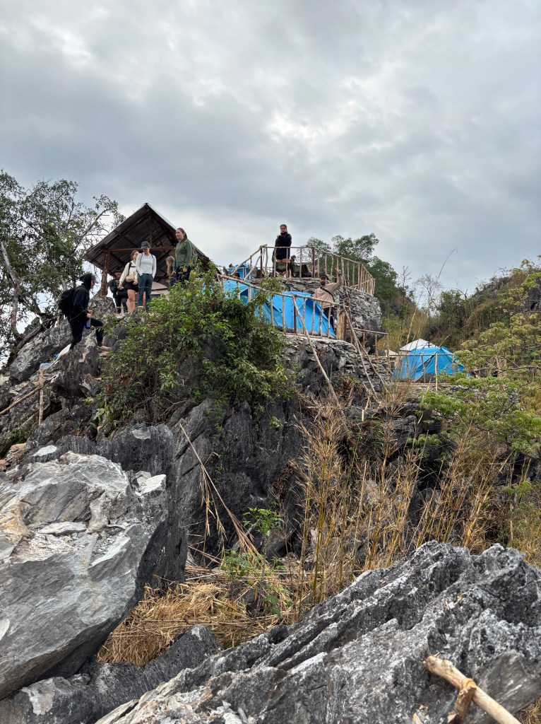 Luang Prabang is a take off point for some interesting trekking in the hills east. I booked a trip to Nong Khiaw to “camp above the clouds”. The minibus from Luang Prabang to the village below the hill takes 4.5 hours – it is all of 85 miles (140 km) but the road is so awful that the vehicles often drive off road or on the wrong side of the road. (Roads are noticeably bad – no investment there.) To maximise the number of passengers in the minivan, little footstools are placed in the spaces between the seats. If you are unlucky to end in one of those, it’s a long time bumping on a hard seat and no back support.