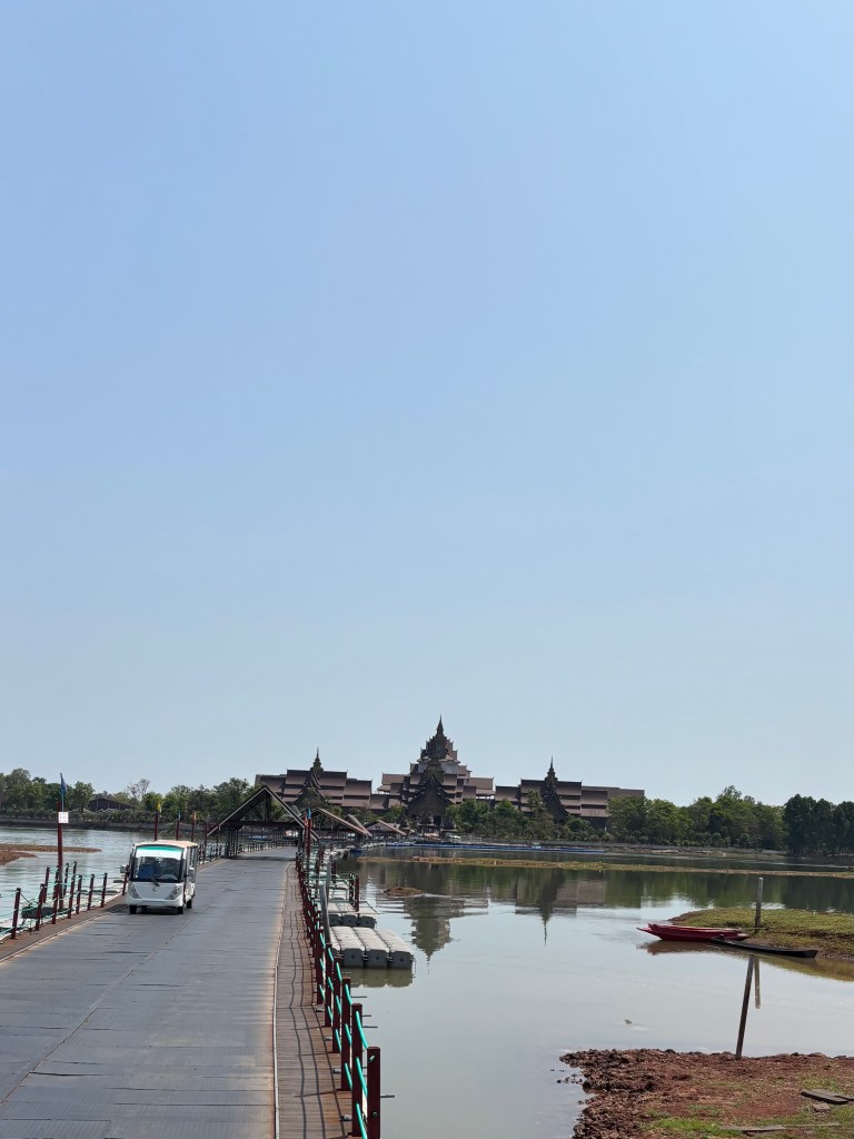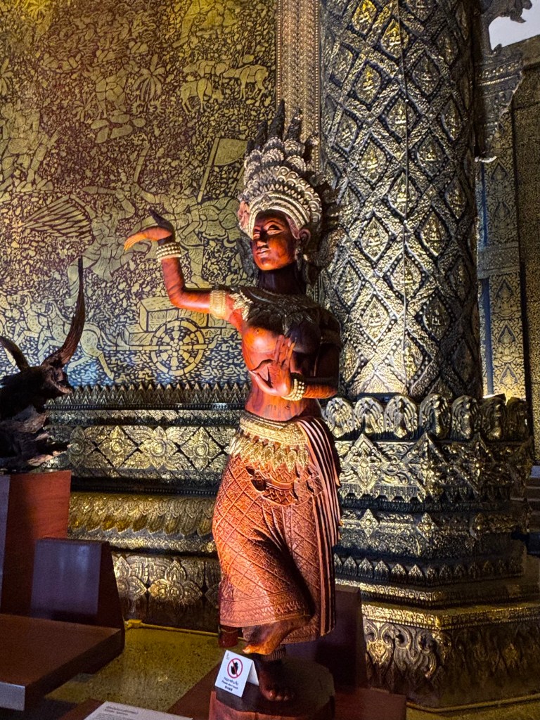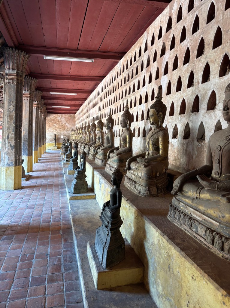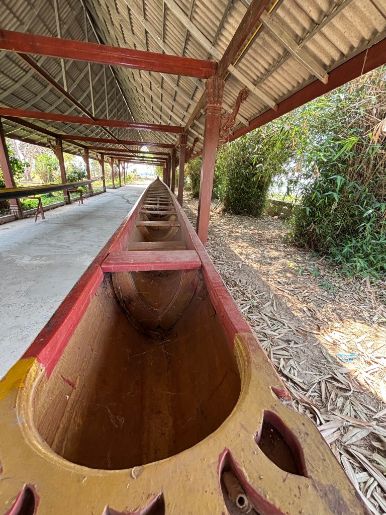 The Vientiane Art Museum is way out of town – the official 10K seems to be a lot more on the motorbike (riding pillion). There is no public transport to it – tours only, or private arrangements. The museum building is on an island, and visitors are ferried there across a pontoon bridge in golf carts. Inside is the Aladin’s cave of fine Laos wood carvings, mainly devotional but also some secular. (The Lonely Planet also mentions the Laos Museum on the same road but that is now “exclusively for the Chinese” where they can purchase things.)