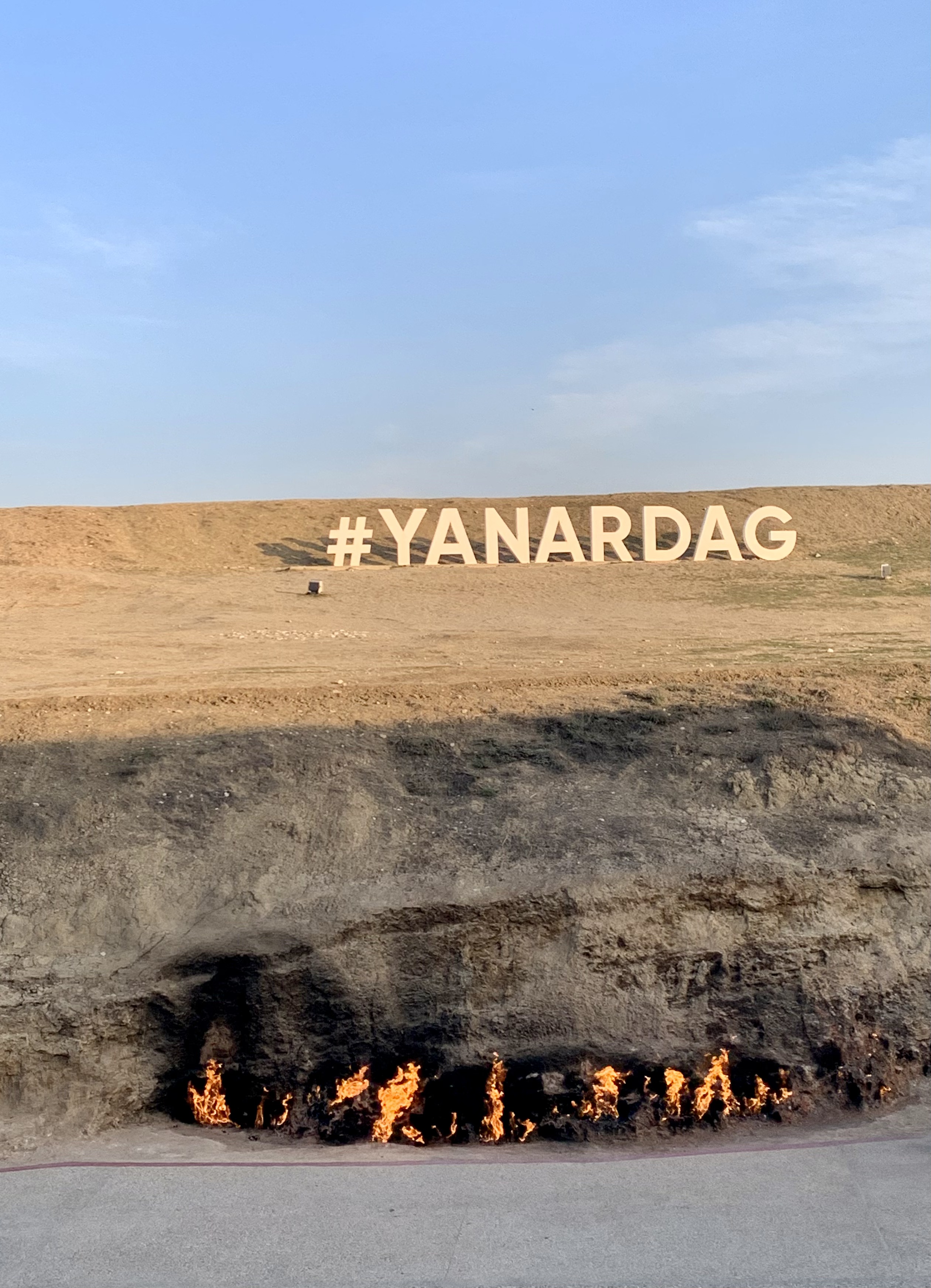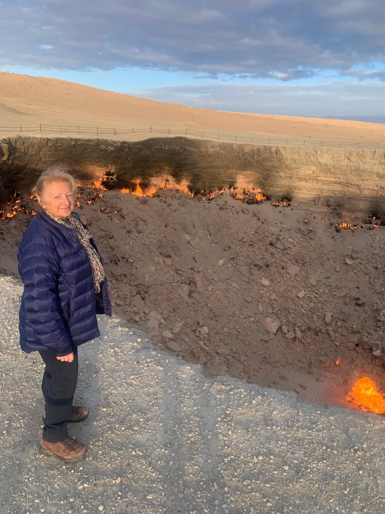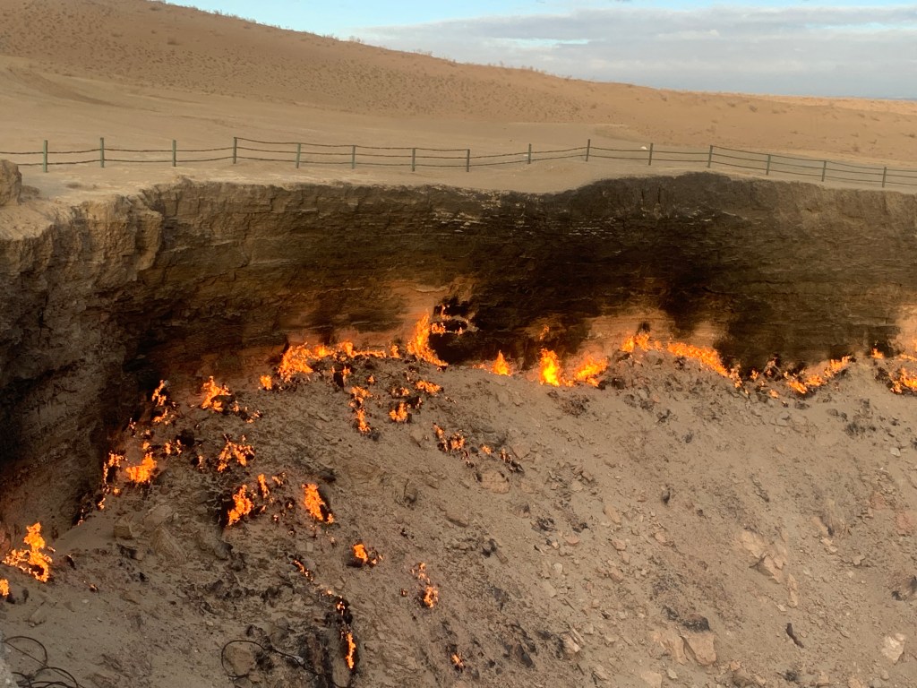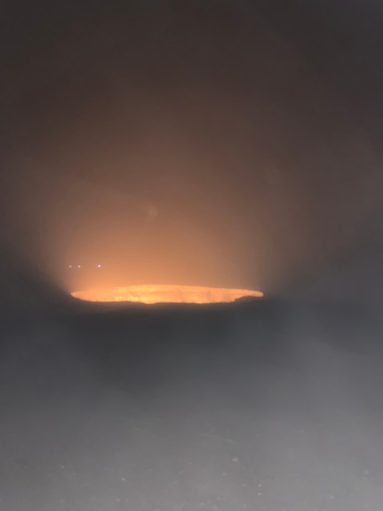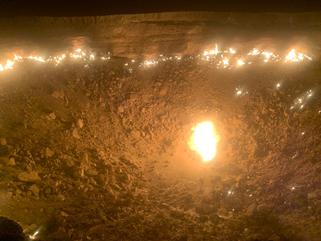 Then a long drive to Darwaza, in the middle of the Karakum desert, where The Gates of Hell gas crater has been burning since the 1970’s when the Soviet experts were prospecting for natural resources (Kara-kum means ‘black sand’, as there is a lot of shale underneath). I was told there had been a lot of heavy equipment in the area at the time and a spark may have caused an explosion that created the crater – there are metal bits and pipes visible at the bottom. The natural gas has been burning since. (It made me smile, thinking of the Azerbaijan’s “Fire Mountain”, which is but a smidgeon compared to the hundreds of clean, smokeless flames around the giant crater.