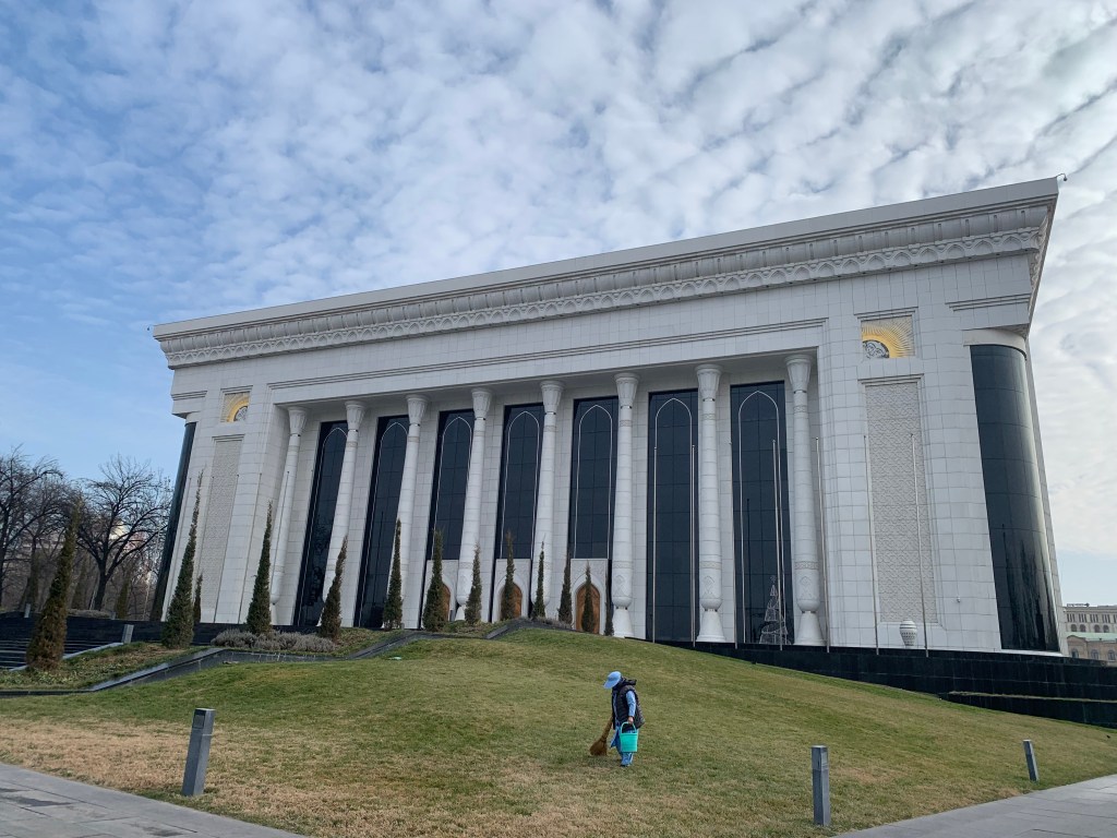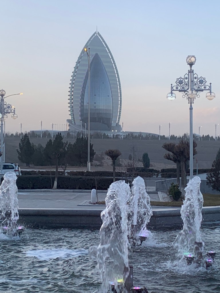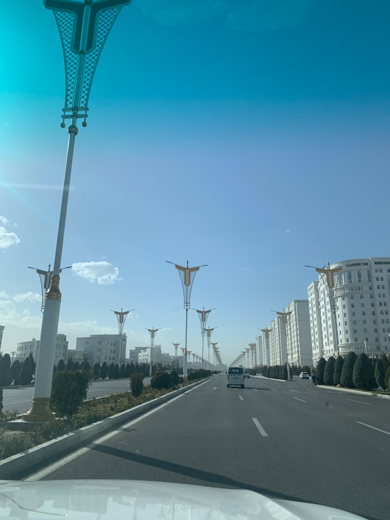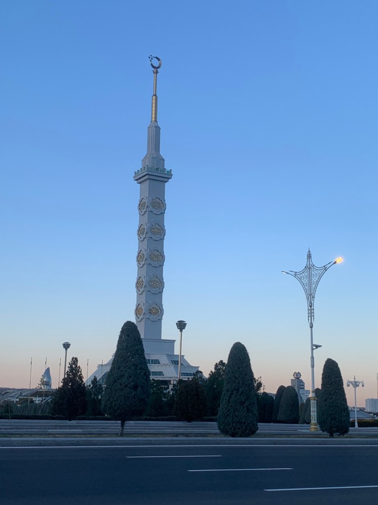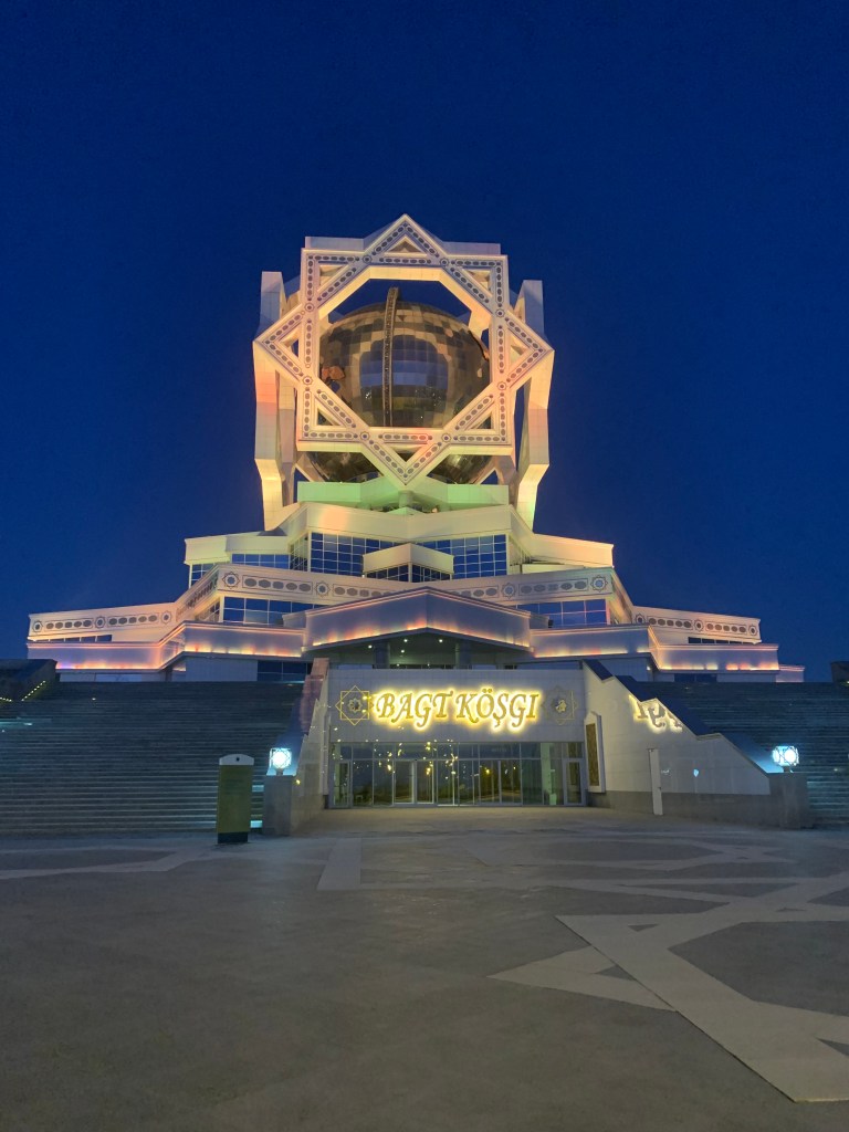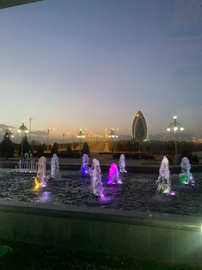 Ashgabat is officially “the whitest city in the world”. The buildings cannot be painted anything but white; the only cars allowed inside the city limits must be white, silver or gold; the street lights (and there are, for once, plenty) are all on white or silver posts. The cars must be clean – else they will get stopped by the traffic police and fined. This has occasioned a very brisk business in car washes in the environs of the city (The Toyota was washed 3 times in the 6 days I was there.) Out of the 5 provinces, cars registered in 2 (Dashoguz and Mary) cannot enter Ashgabat, whatever their colour and state of cleanliness – they must be left on the outskirts. The city roads are in perfect condition, wide and spotlessly clean. Very few people outside, except for the street cleaners (mainly women with brooms). No traffic jams. There is a sterile and sterilised feel to the town, as after an apocalypse. However, when the night falls, the psychedelic multicoloured lights play on every building, including the high rise apartment blocks.