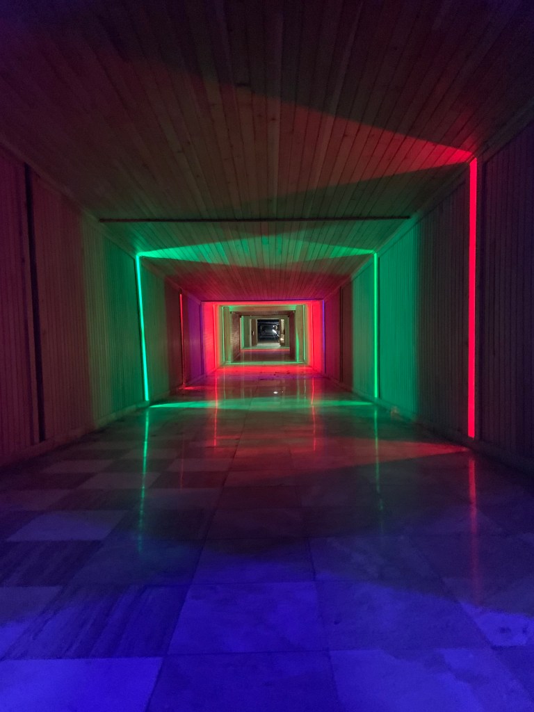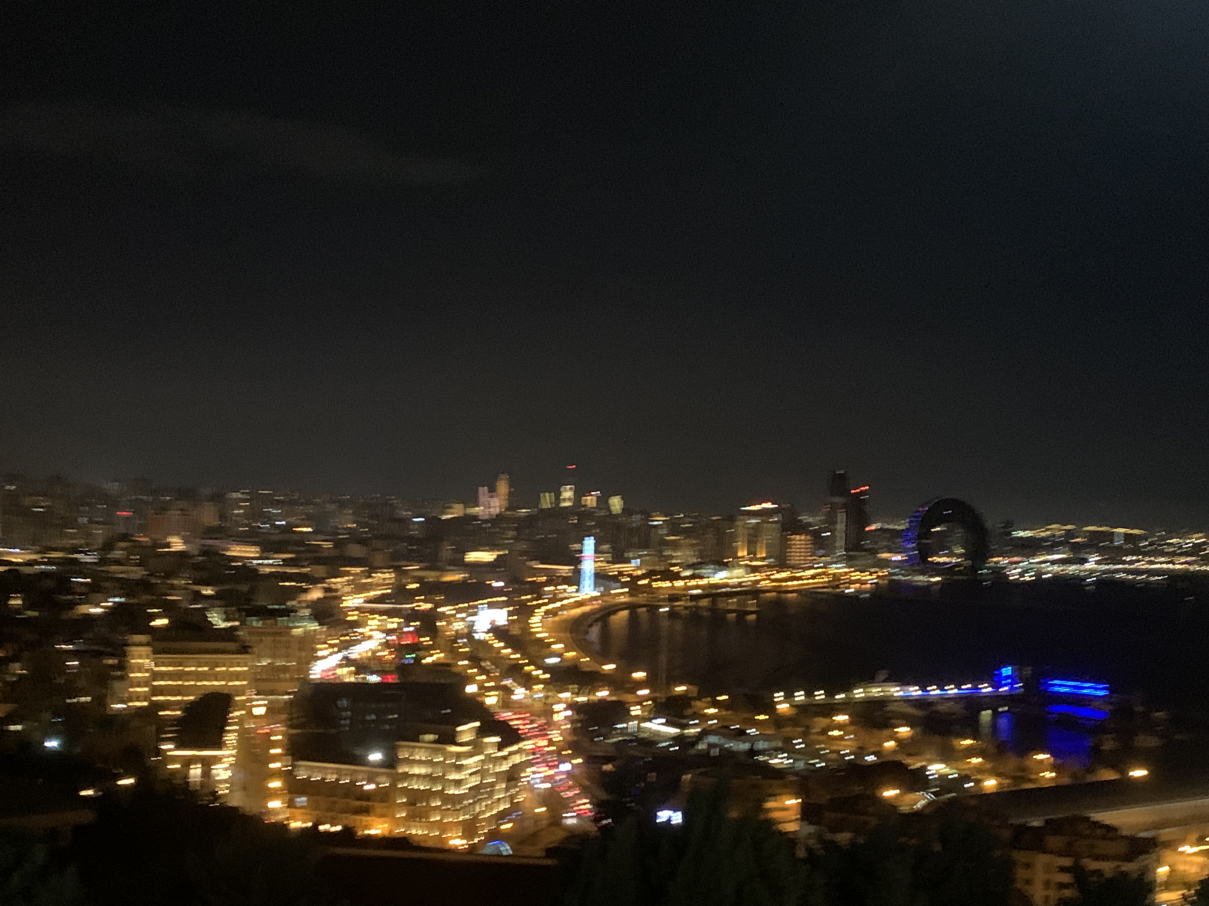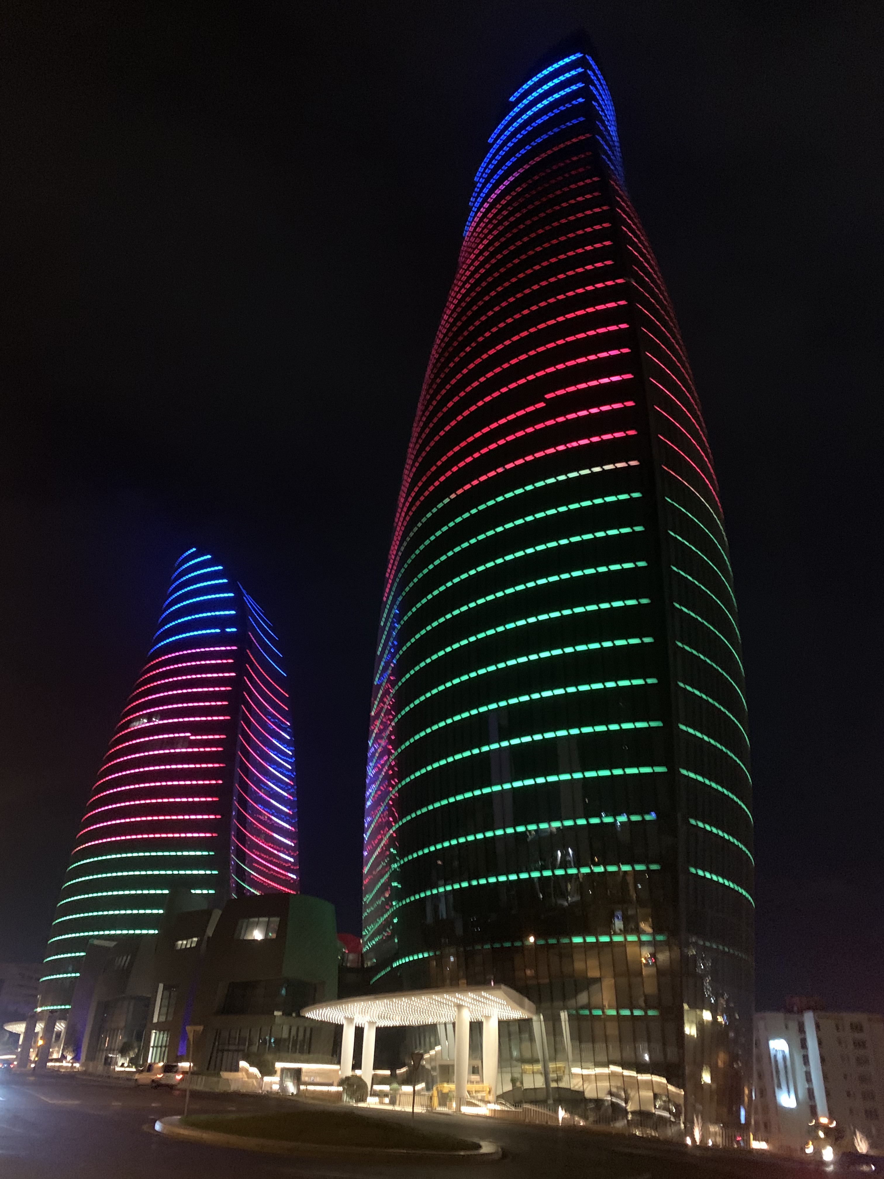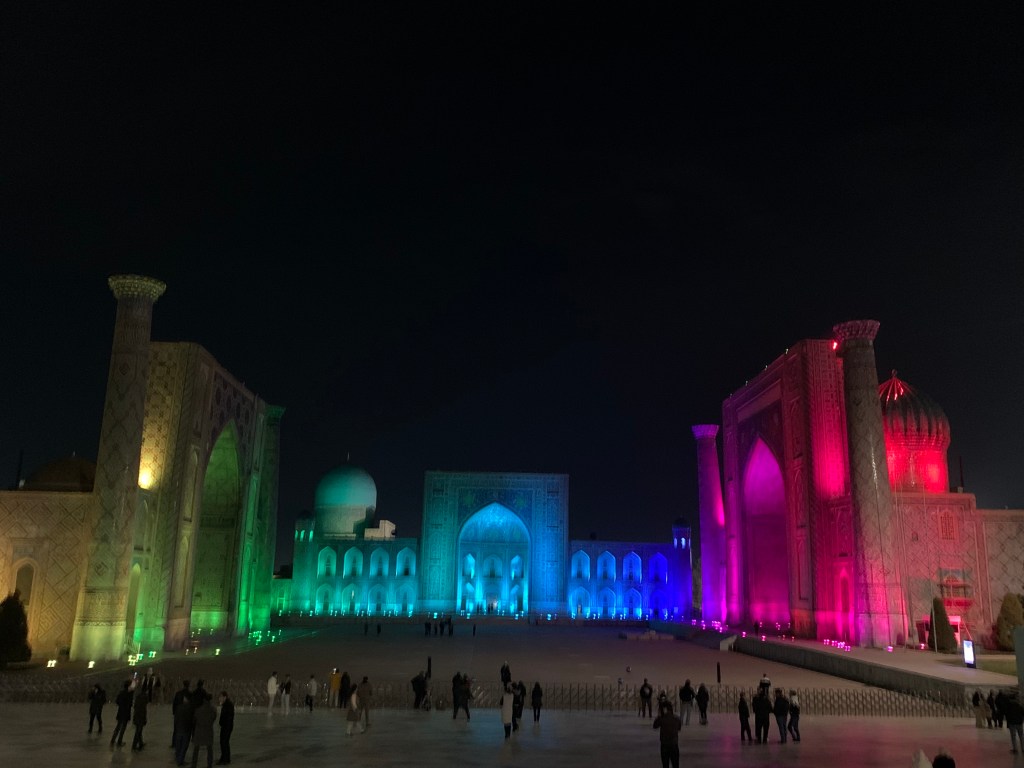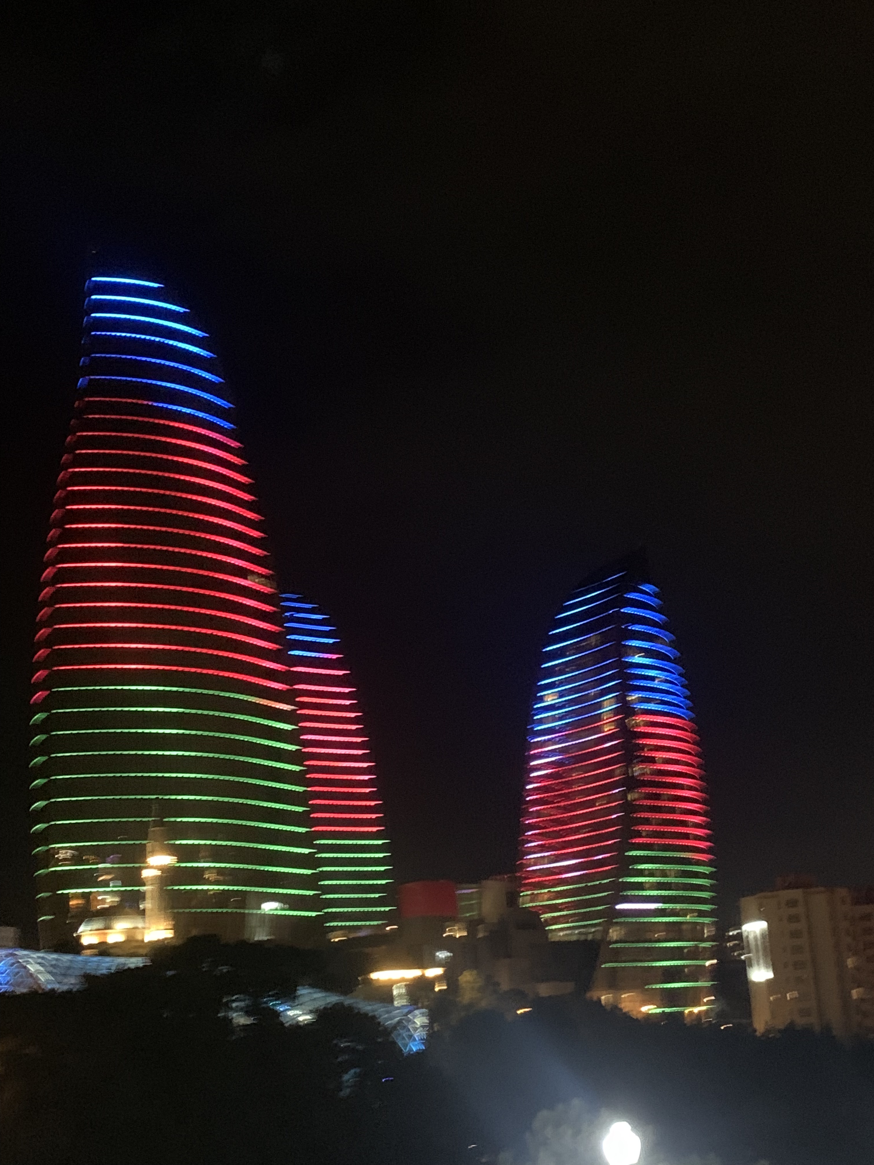 Ashgabat is officially “the whitest city in the world”. The buildings cannot be painted anything but white; the only cars allowed inside the city limits must be white, silver or gold; the street lights (and there are, for once, plenty) are all on white or silver posts. The cars must be clean – else they will get stopped by the traffic police and fined. This has occasioned a very brisk business in car washes in the environs of the city (The Toyota was washed 3 times in the 6 days I was there.) Out of the 5 provinces, cars registered in 2 (Dashoguz and Mary) cannot enter Ashgabat, whatever their colour and state of cleanliness – they must be left on the outskirts. The city roads are in perfect condition, wide and spotlessly clean. Very few people outside, except for the street cleaners (mainly women with brooms). No traffic jams. There is a sterile and sterilised feel to the town, as after an apocalypse. However, when the night falls, the psychedelic multicoloured lights play on every building, including the high rise apartment blocks.