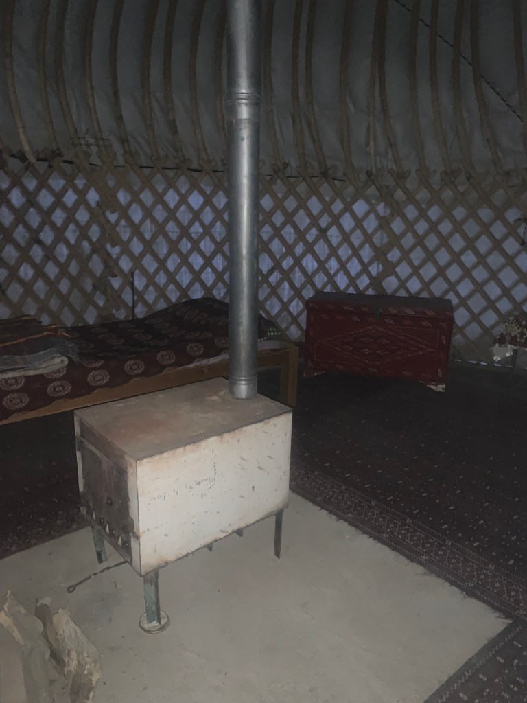 Owadan travel built and owns the yurts here and this is where I slept. This being February, I was, yet again, the only visitor. But I was well looked after, and there was a fire in the little stove in the yurt. (The loo, though, could not be put closer – at 50m, it is a trek.)
