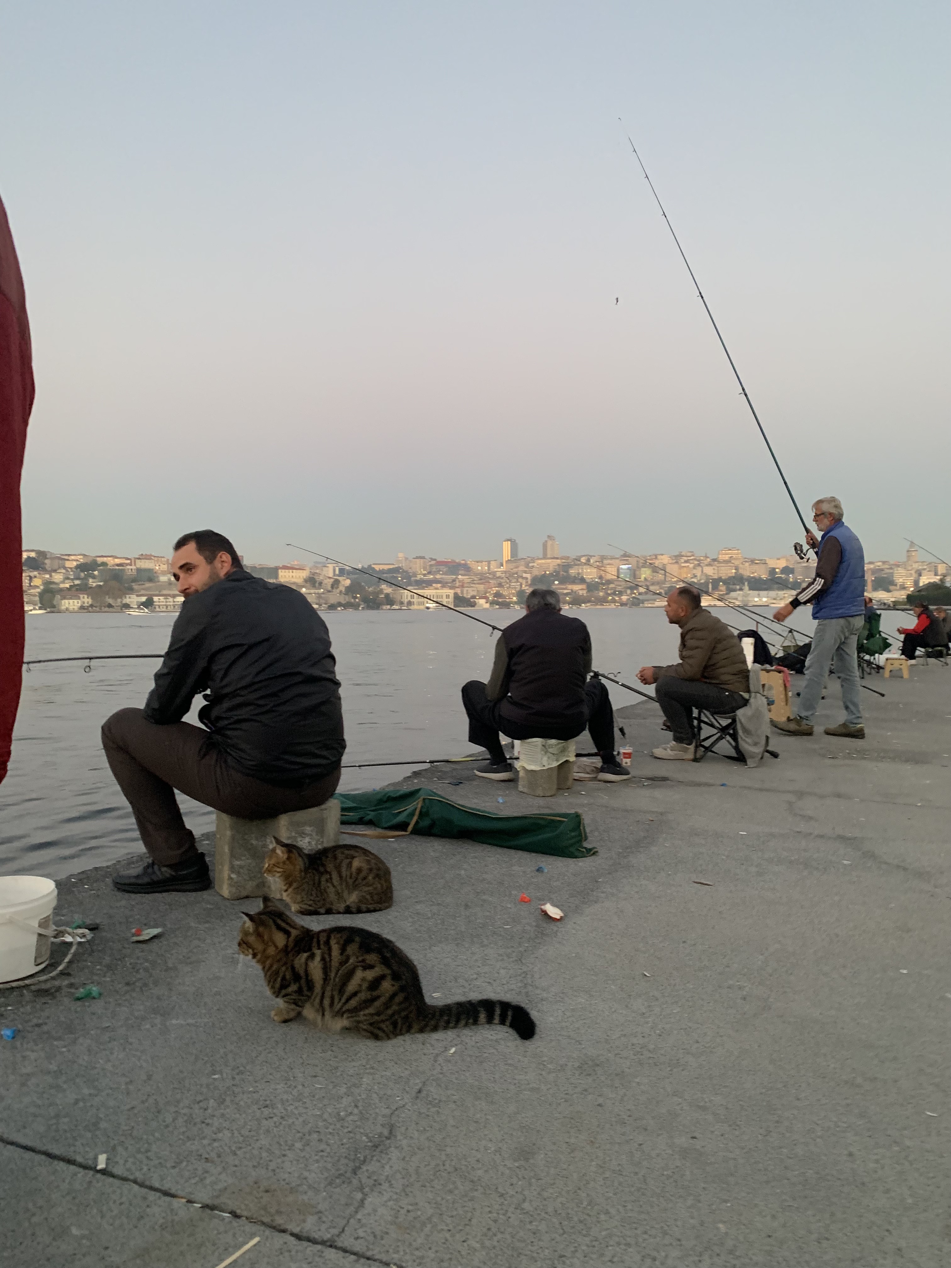 Walking back to my room in the dusk, the fishermen strung along the shore like beads, patiently waiting – this is the anchovy season, and they keep the catch in plastic pails). And cats. looking as if they didn’t really care.